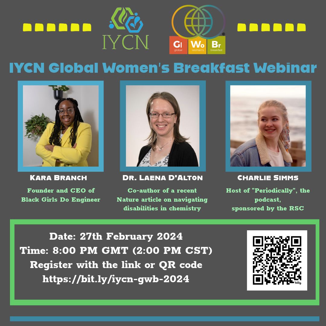 Global Women’s Breakfast this year is about Catalyzing Diversity in Chemistry, and we are thrilled to announce the speakers for webinar: Kara Branch (@BGDECorp), Dr. Laena D’Alton (@laenadalton), and Charlie Simms (@periodically_ox).