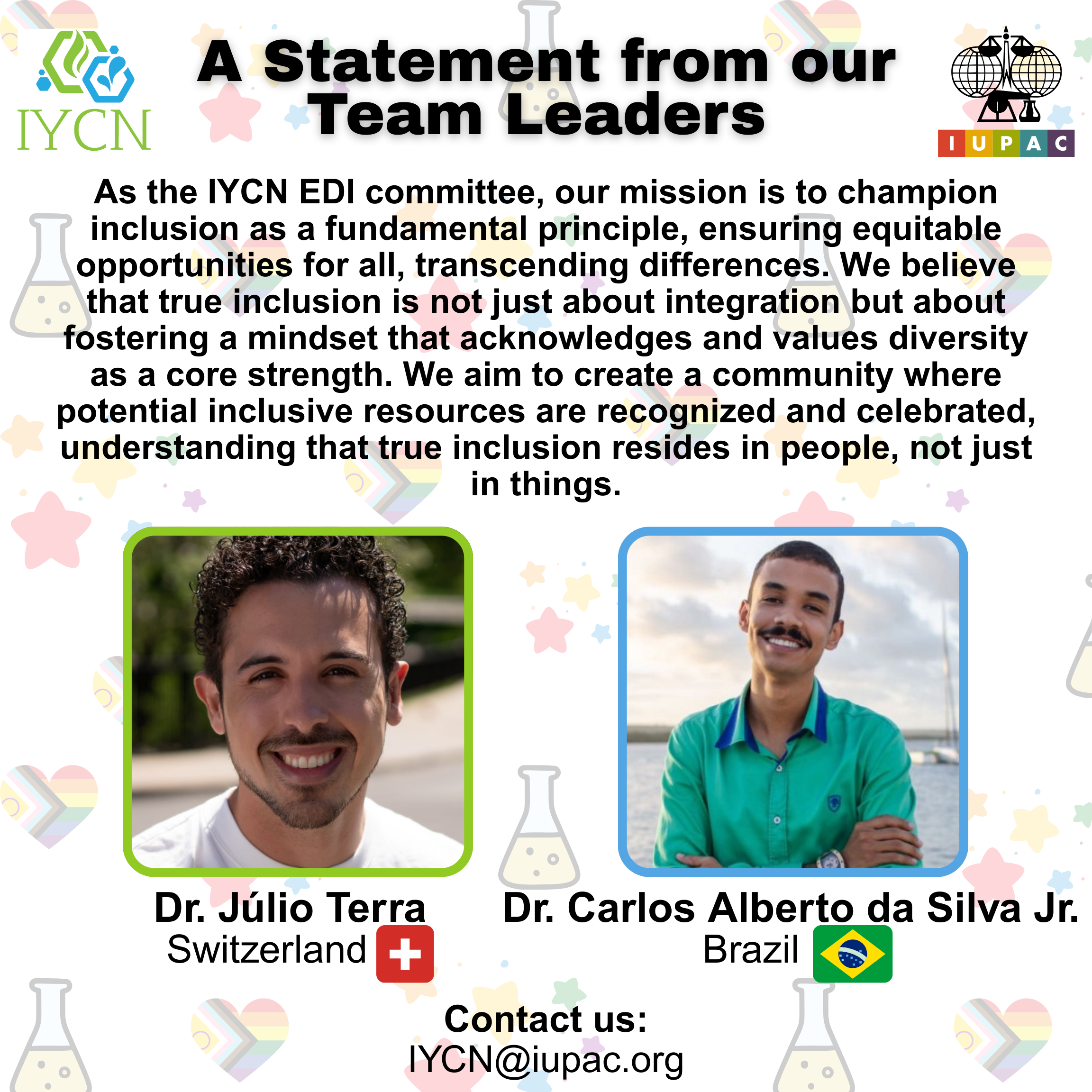 At the International Younger Chemists Network (IYCN), we know that innovation in chemistry thrives when every voice is heard. Thatโ€™s why our Equity, Diversity & Inclusion (EDI) Team is dedicated to building a global community where all younger chemists feel empowered to contribute, connect, and lead.