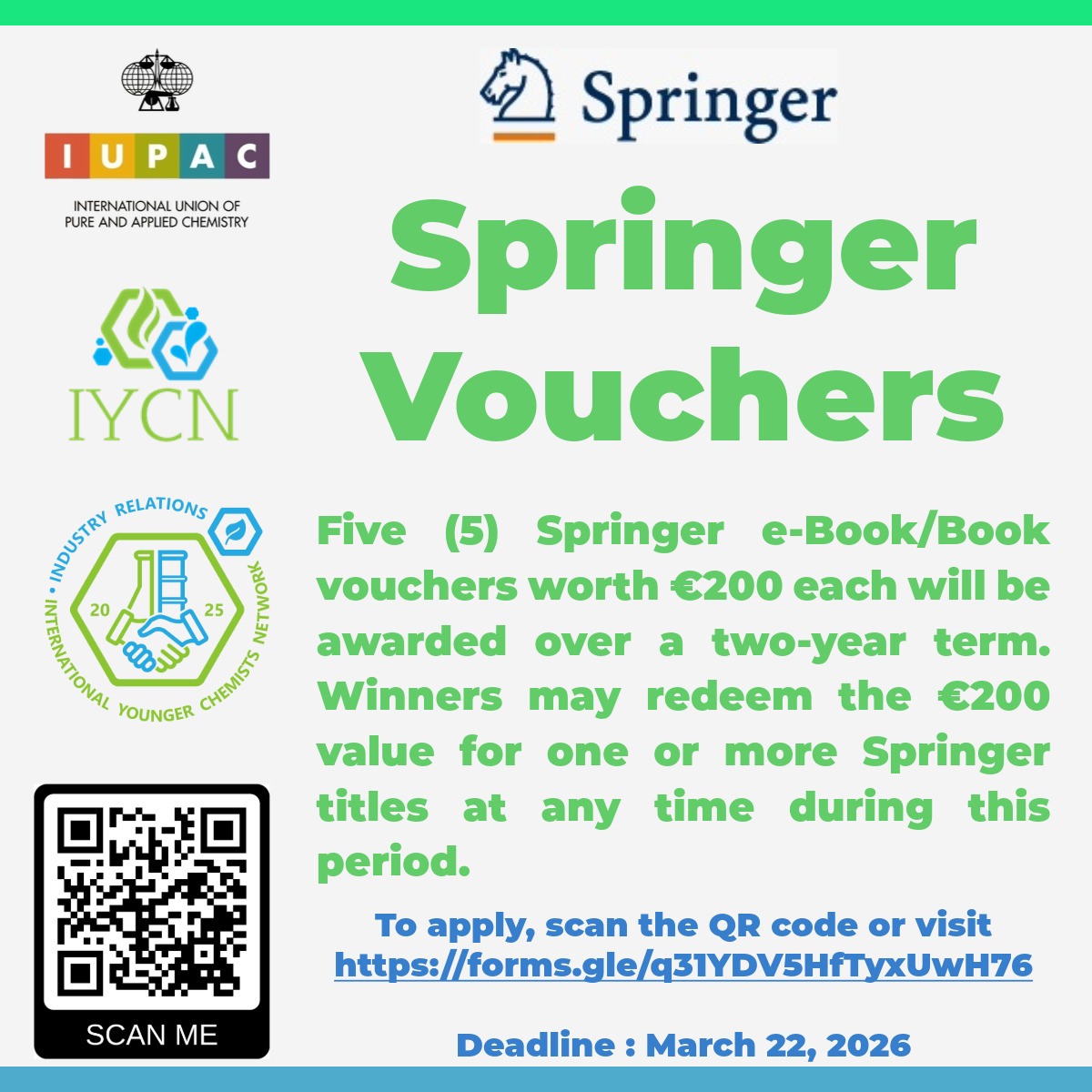 The Industry Relations Team of the International Younger Chemists Network (IYCN) is offering five (5) Springer e-Book/Book vouchers, each worth €200, to be awarded over a two-year period.